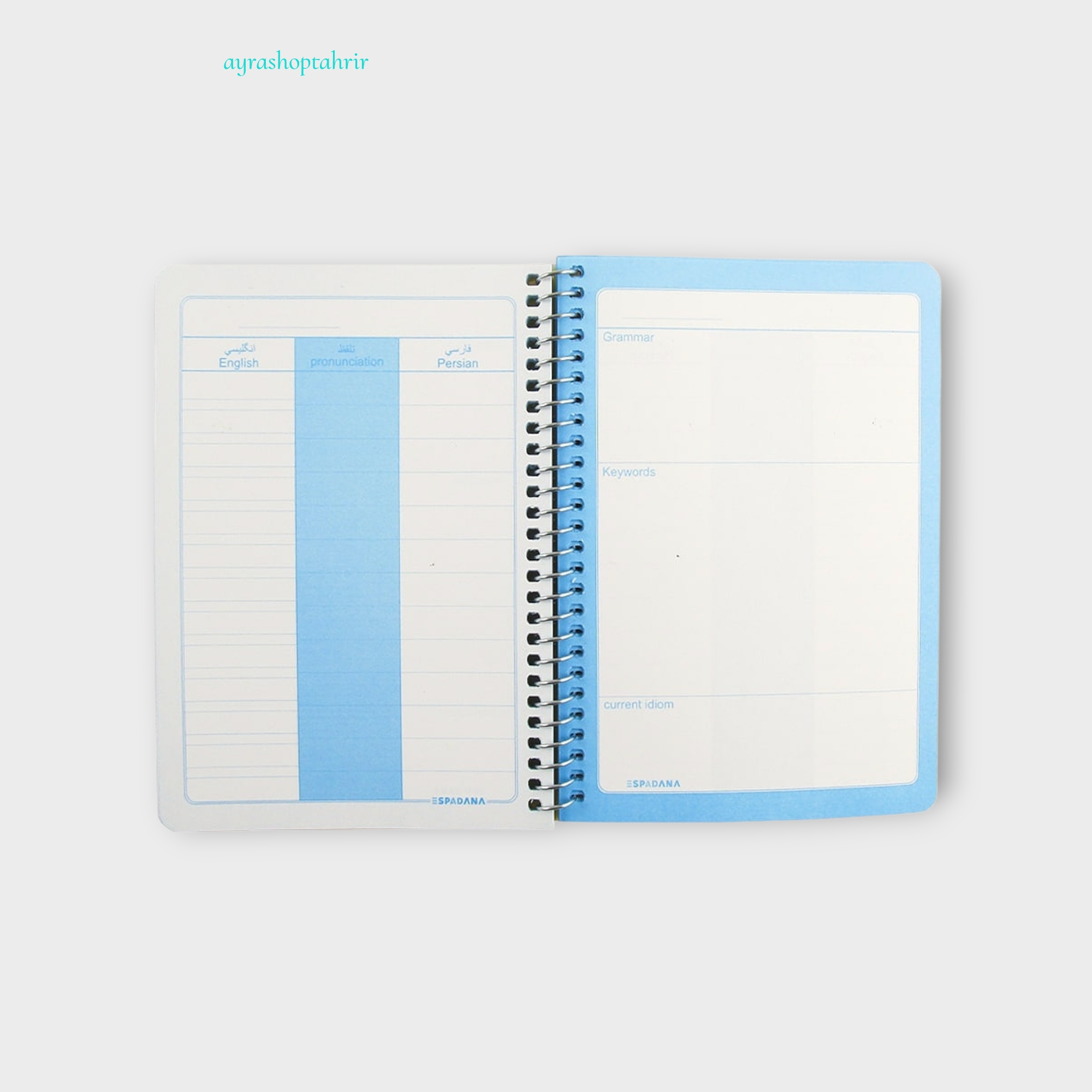 ابعاد 12× 17.5 پشت برگه ها مناسب یادداشت اصطلاحات و گرامر روی برگه ها مناسب نوشتن لغات و معنی لغات جلد طلقی راه راه